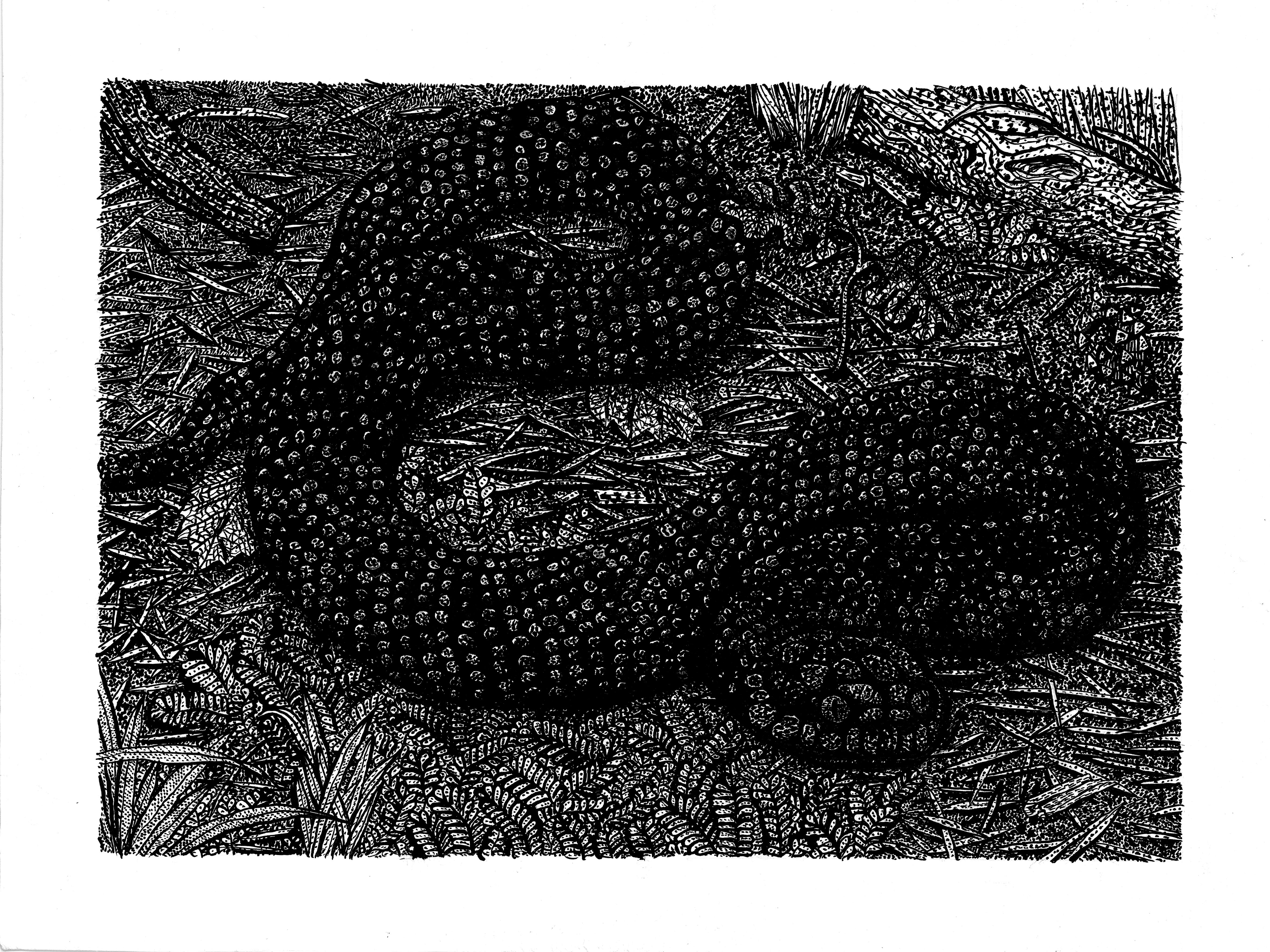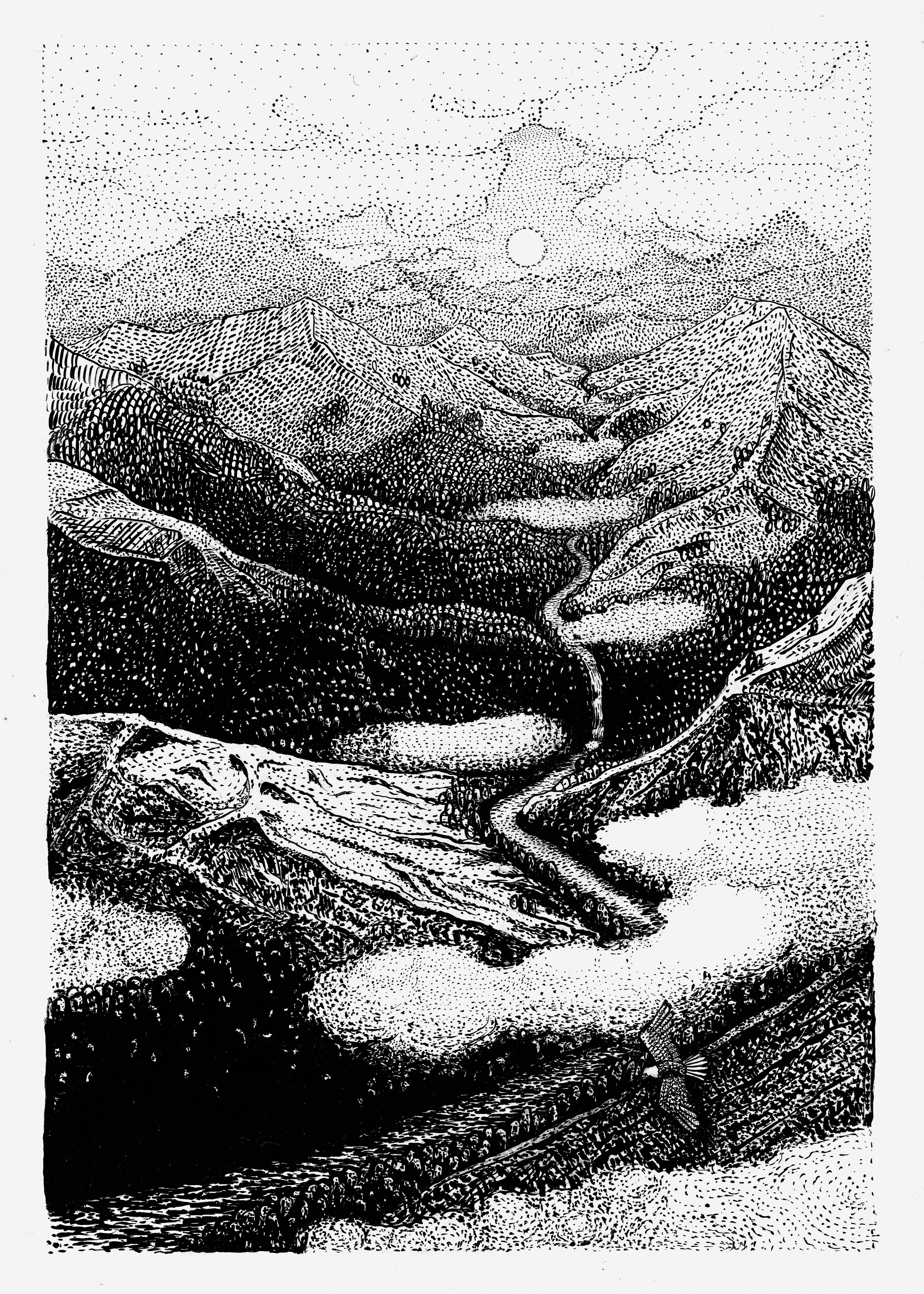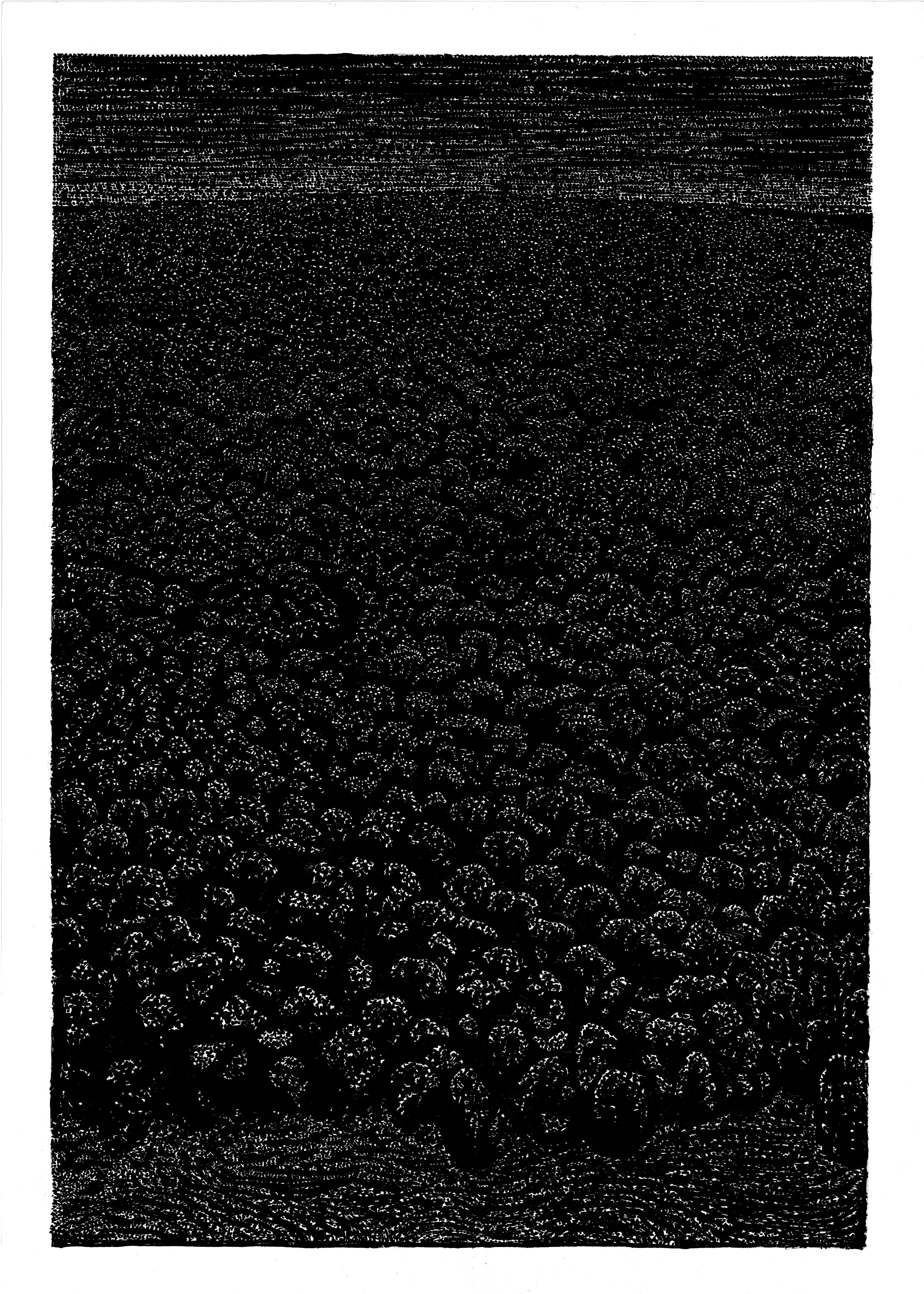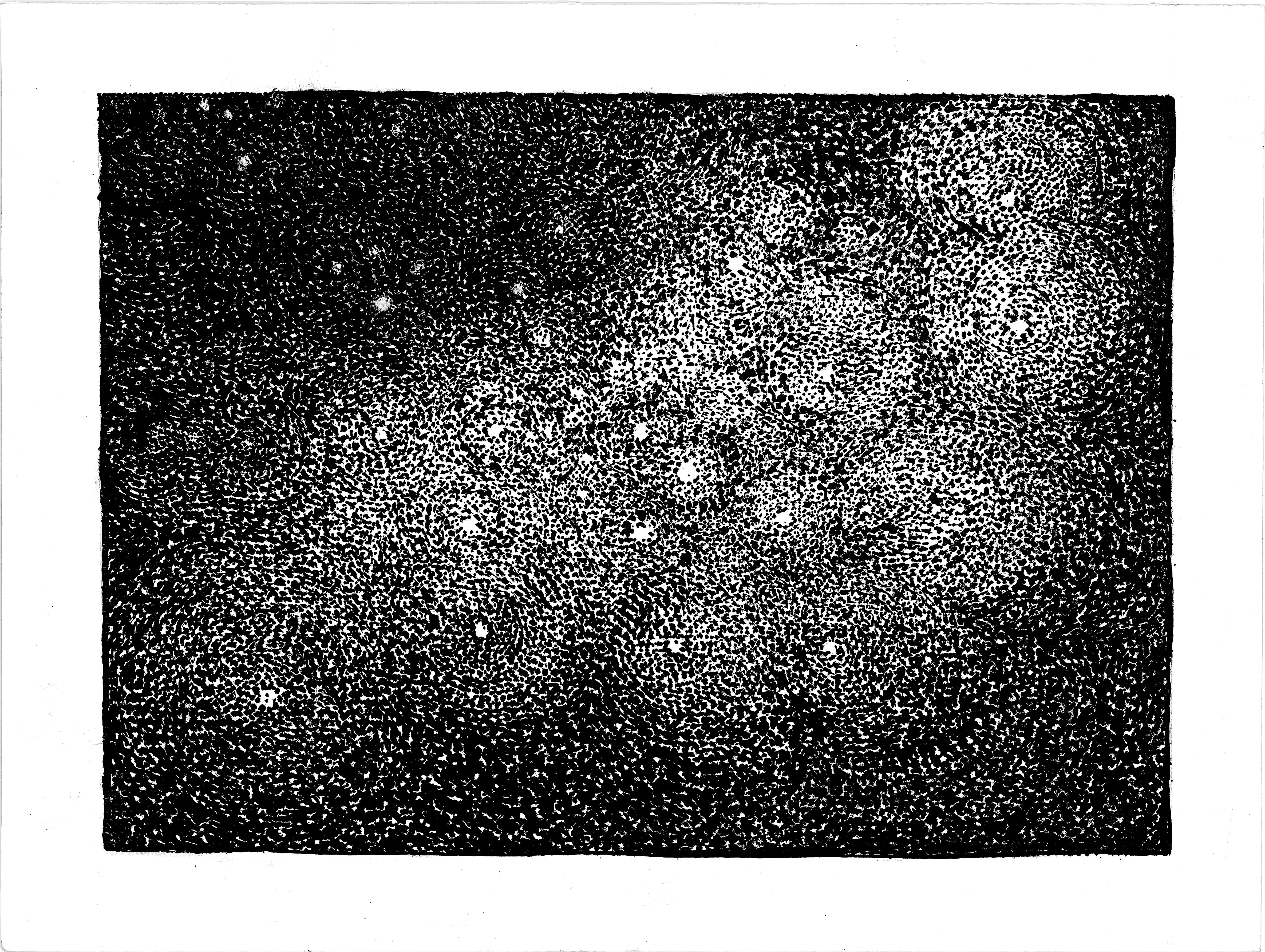 Nowy język którym posługuje się artysta jest zawieszony pomiędzy monotonnym noisem gazowego obłoku, a konwulsyjną wyrazistością demonicznych archetypów. Z tym samym zainteresowaniem i empatią traktuje egzotyczne istoty zamieszkujące jego świat, co pojedyncze cząsteczki skłębionego kosmicznego pyłu. Budując pewien malarski świat nie zadowala się umowną scenografią, ale poświęca równą uwagę wszystkiemu co powołuje do istnienia. Tematem tych prac jest bardziej materia rzeczywistości, niż wyprodukowane z niej stworzenia. Zwierzęta są utkane z tej samej substancji , co otaczająca je flora, z zagęszczonego gazu, który wydobywa się z kraterów. Osobne byty nie mają wyraźnych granic, ich przedłużeniem jest cały wszechświat. Kiedy zbliżamy twarz do powierzchni rysunków Michała Polaczka, obraz rozpada się w miazgę grubych kropel tuszu, kiedy oddalamy się, znowu doświadczamy makroskali i z graficznego prochu powstają zwierzęta, oceany, galaktyka.